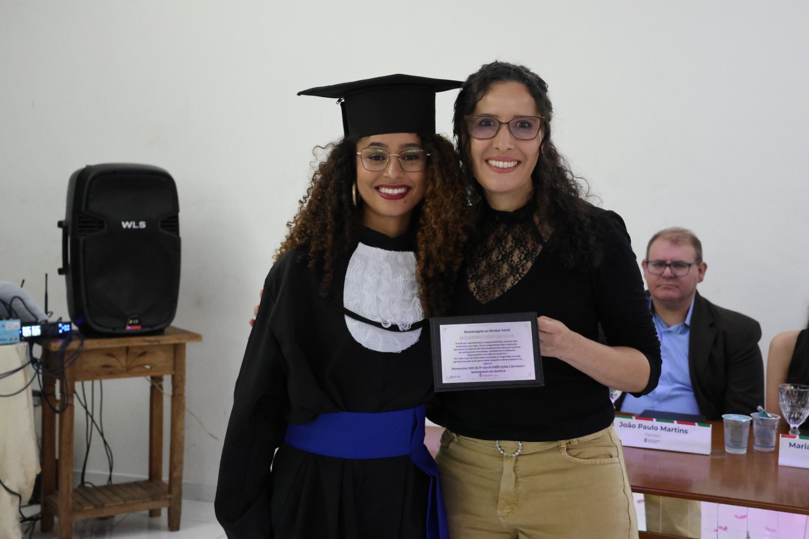 Compuseram a mesa diretora, a Pró-Reitora de Extensão, Professora Daniela Ferreira Cardoso; a Diretora-Geral Substituta, Eliane Silva Ribeiro; o Paraninfo das turmas do integrado, professor Emerson José Simões da Silva; a patronese Mariana Pereira; o patrono do curso subsequente, professor João Paulo Martins e as homenageadas, professoraa Adriana Falqueto Lemos e Tatiana de Freitas Silva.