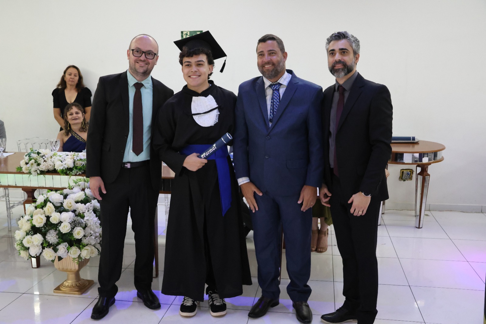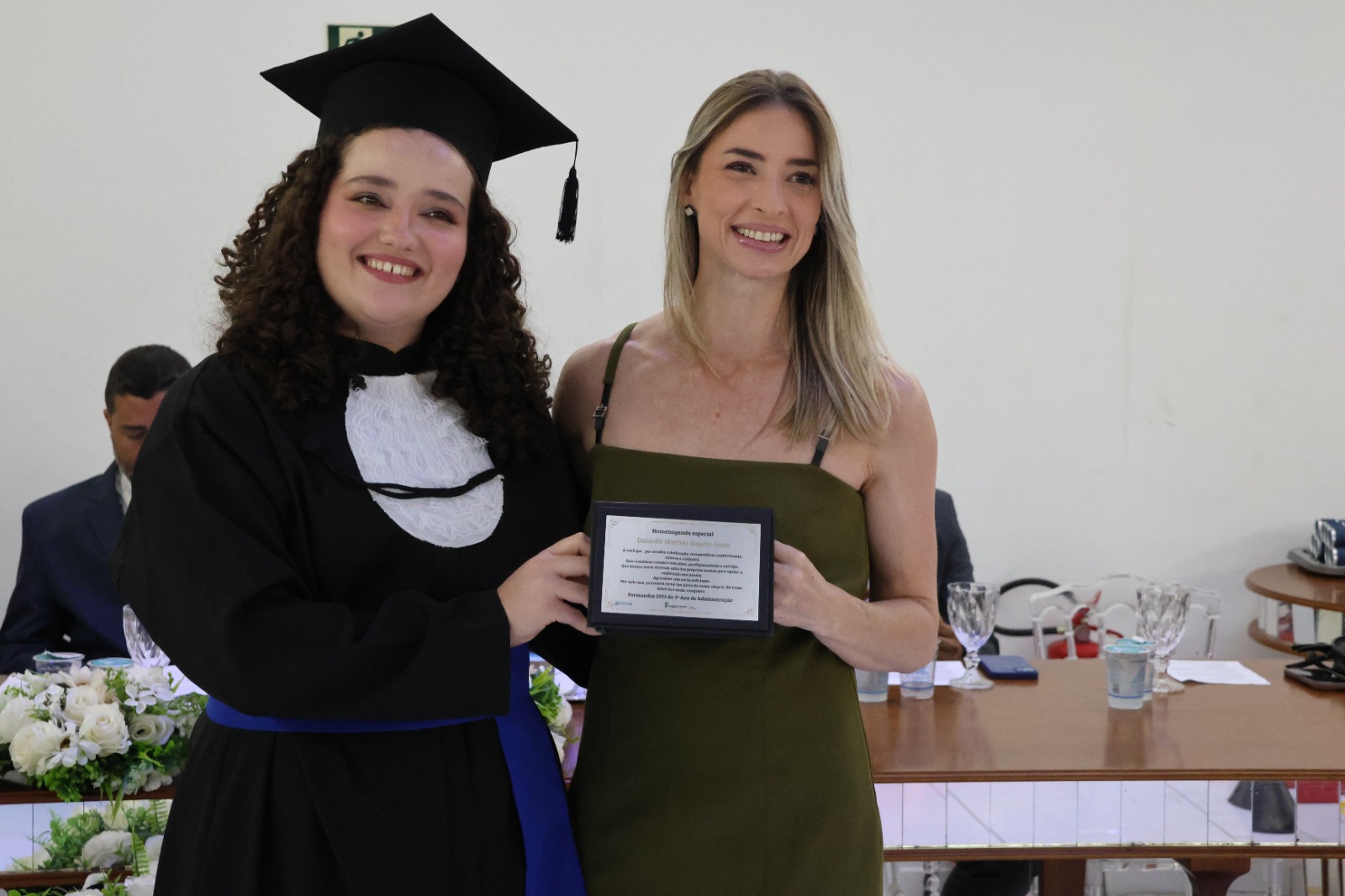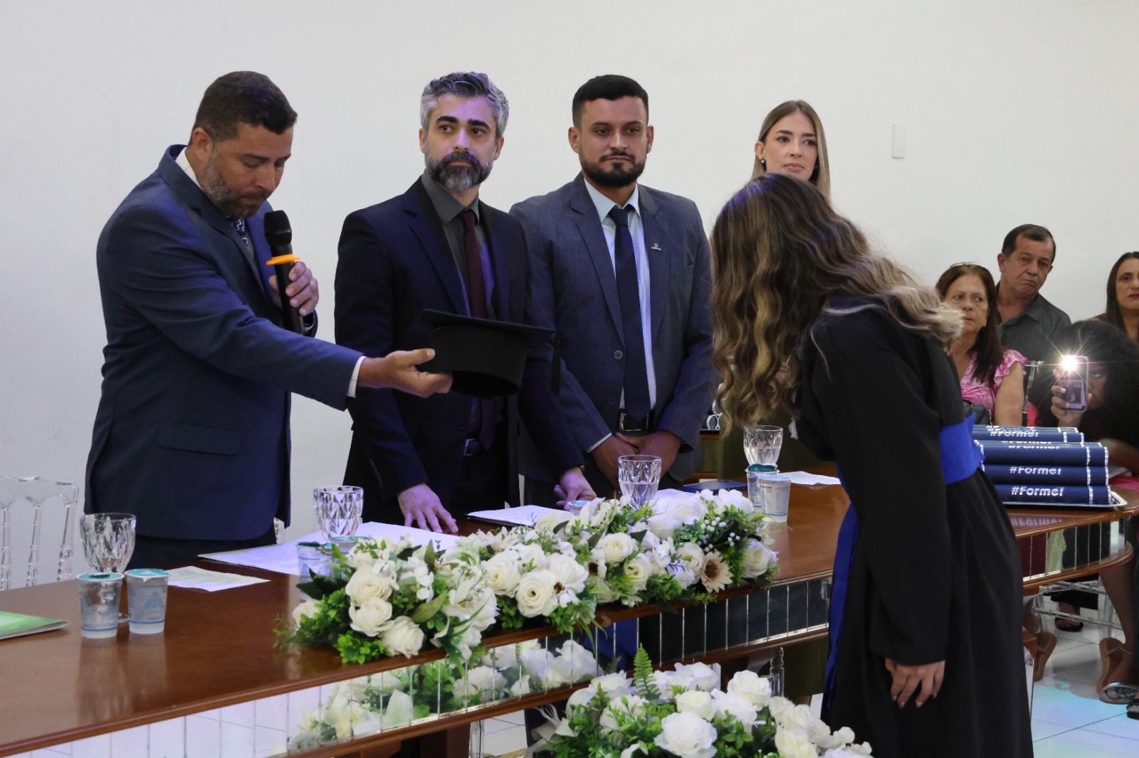 A Mesa Diretora da cerimônia foi presidida pelo Diretor de Desenvolvimento e Relações Institucionais do IF, Luis Adriano Batista, que representou o Reitor, Professor Cléber Ávila Barbosa. O evento também contou com a presença do Diretor- Geral, Professor Alexandre Fieno; da paraninfa das turmas, Professora Emanuelle Kopanyshyn; do Professor Leonardo dos Santos Maria, Patrono da turma de Administração; do Professor Luís Antônio Tavaraes, Patrono da turma de Informática; da Professora Danielle Martins Duarte Costa, homenageada da turma de Administração; e do Professor Rogério Coli da Cunha, homenageado da turma de Informática.