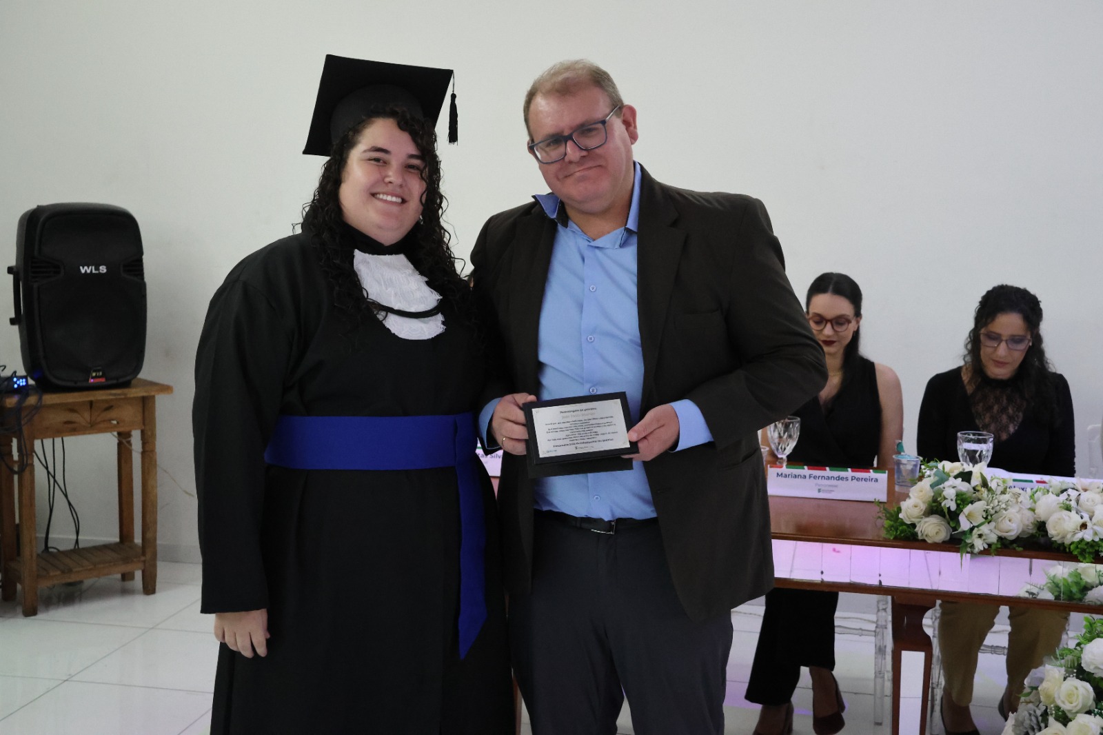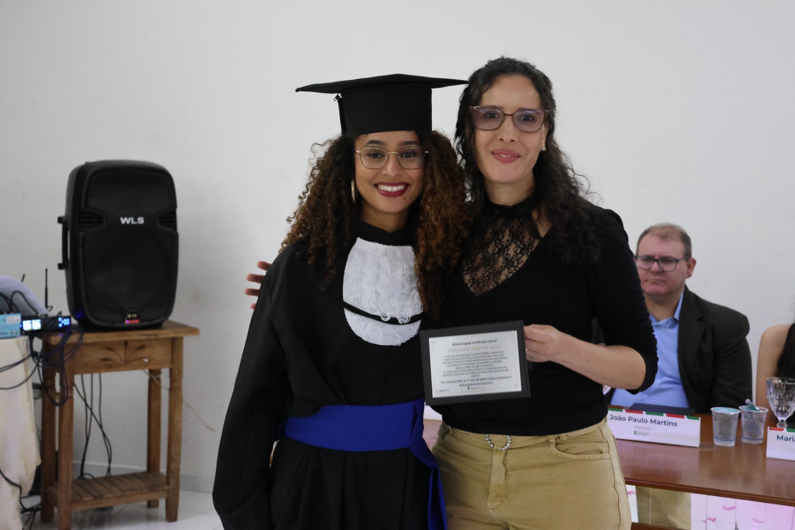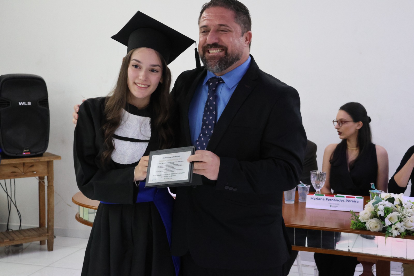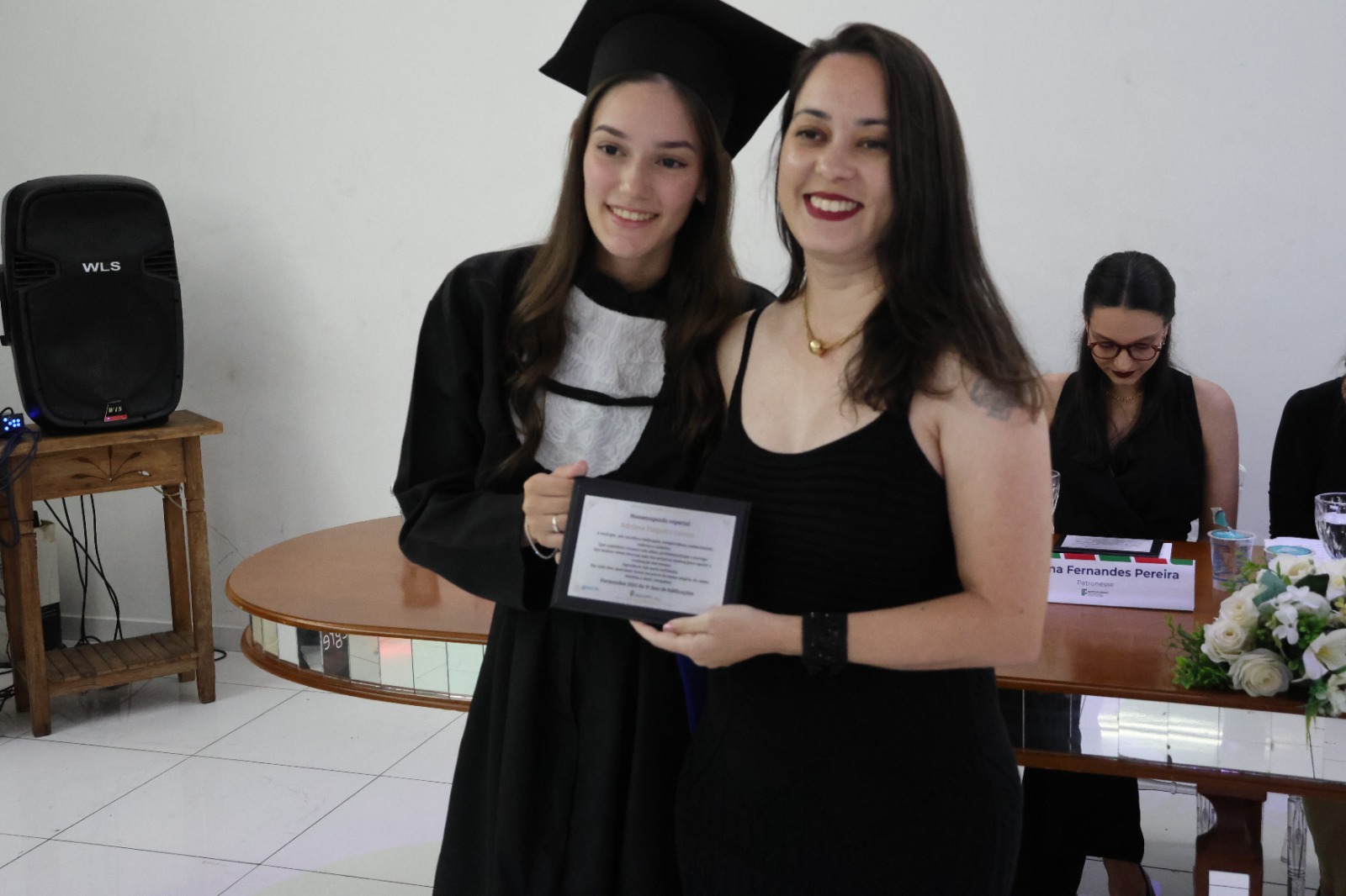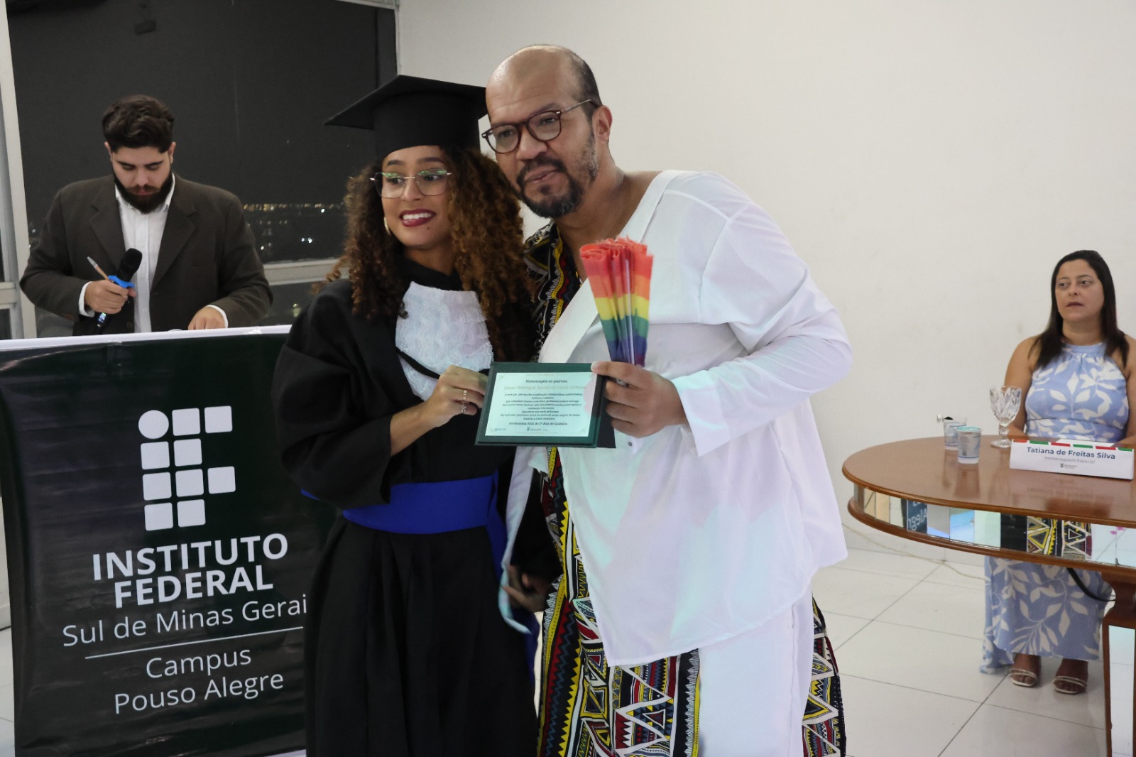 Compuseram a mesa diretora, a Pró-Reitora de Extensão, Professora Daniela Ferreira Cardoso; a Diretora-Geral Substituta, Eliane Silva Ribeiro; o Paraninfo das turmas do integrado, professor Emerson José Simões da Silva; a patronese Mariana Pereira; o patrono do curso subsequente, professor João Paulo Martins e as homenageadas, professoraa Adriana Falqueto Lemos e Tatiana de Freitas Silva.