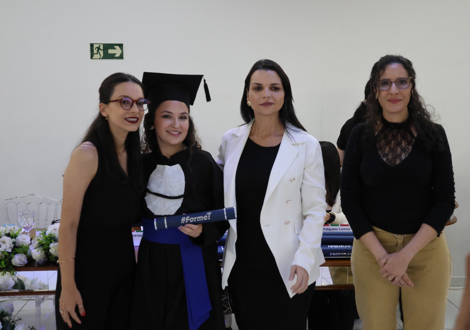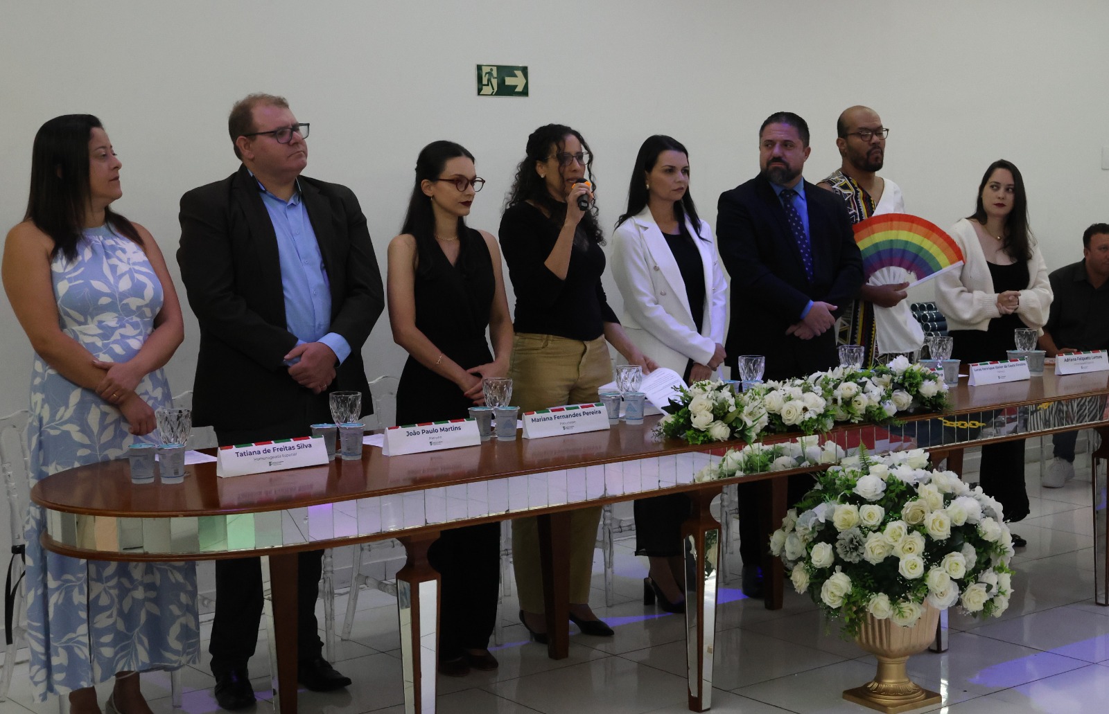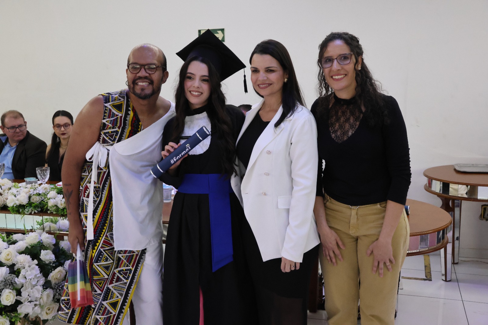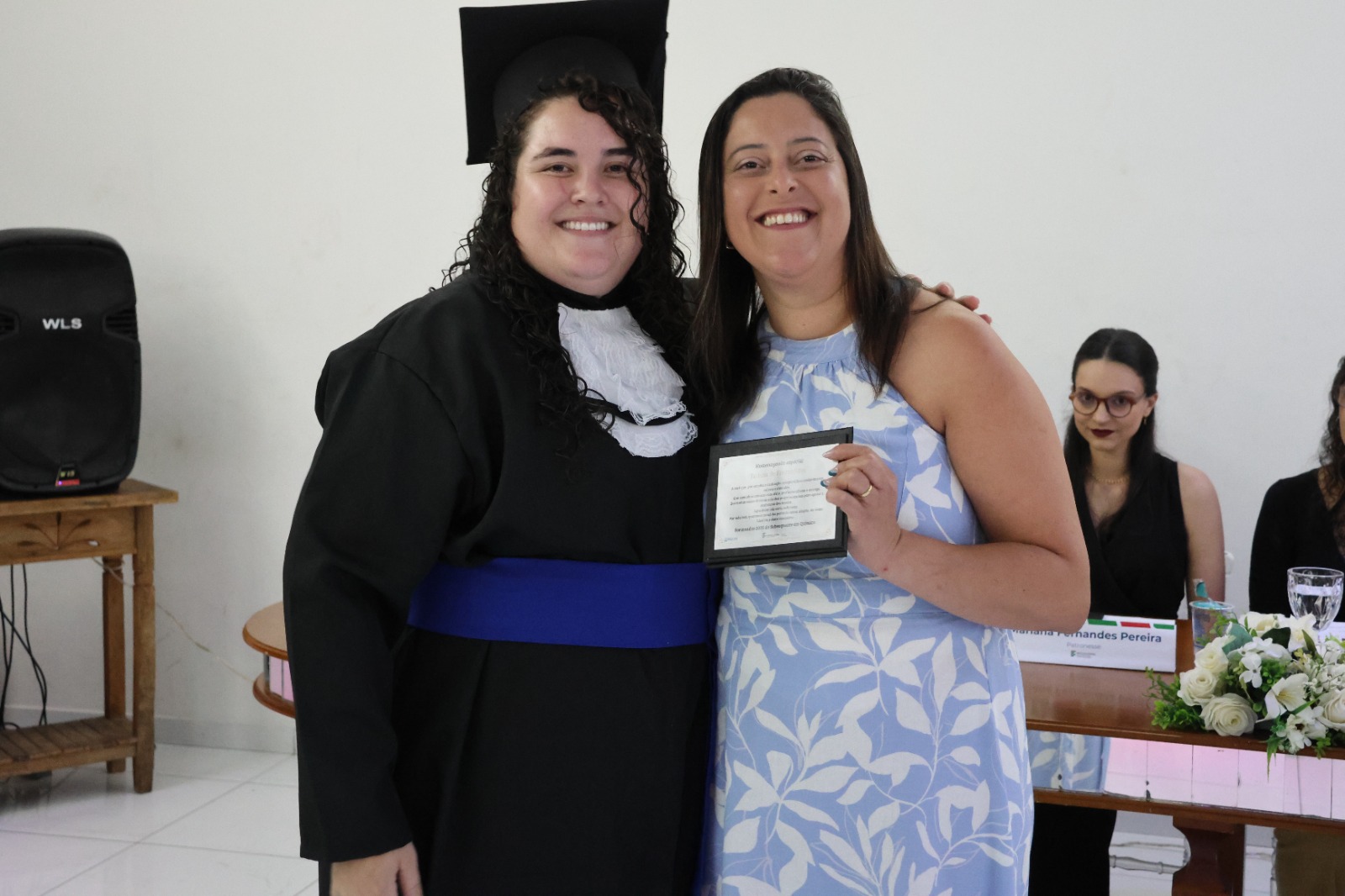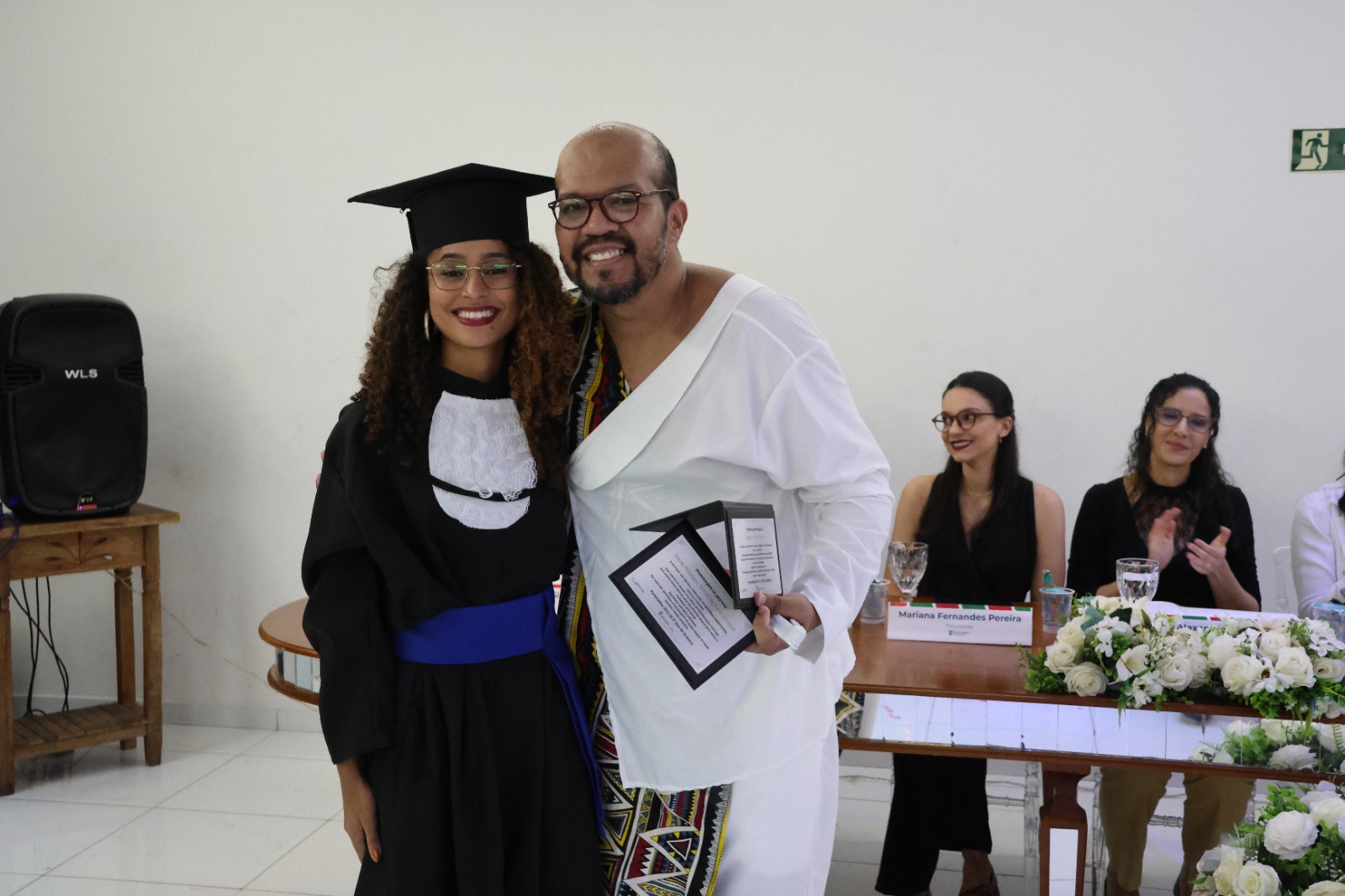 Compuseram a mesa diretora, a Pró-Reitora de Extensão, Professora Daniela Ferreira Cardoso; a Diretora-Geral Substituta, Eliane Silva Ribeiro; o Paraninfo das turmas do integrado, professor Emerson José Simões da Silva; a patronese Mariana Pereira; o patrono do curso subsequente, professor João Paulo Martins e as homenageadas, professoraa Adriana Falqueto Lemos e Tatiana de Freitas Silva.