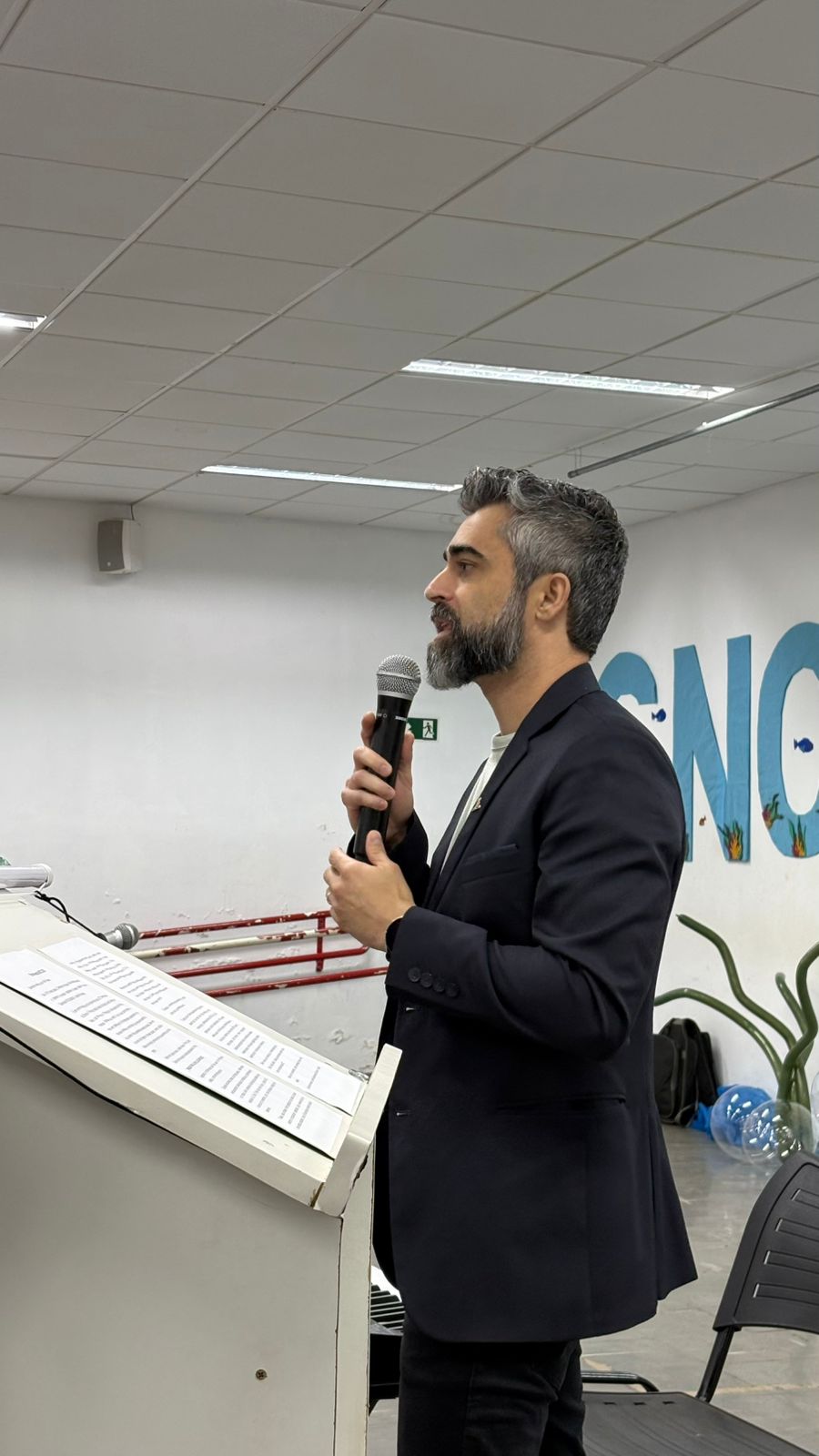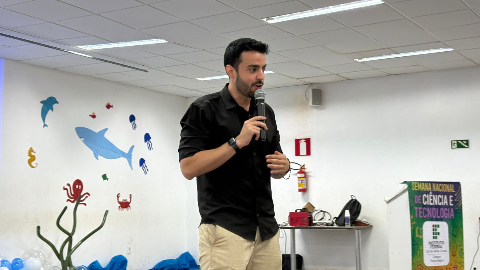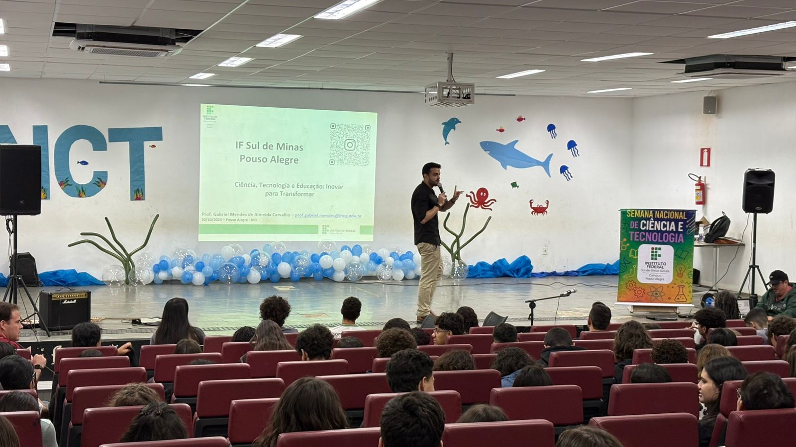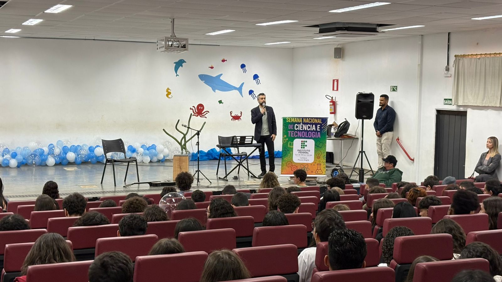 Com o tema “Ciência, Tecnologia e Educação: inovar para transformar”, o professor de Engenharia Mecânica do IFMG - Campus Betim, Gabriel Mendes, realizou experimentos práticos demonstrando como a ciência e a química estão presentes em nosso cotidiano. Ele enfatizou a relevância do conhecimento na transformação da sociedade e incentivou os estudantes dos cursos técnicos a buscarem constante aprimoramento, destacando que o mercado exige, cada vez mais, profissionais bem qualificados. Mendes também ressaltou o papel dos educadores em estimular a motivação dos alunos. Segundo ele, além de ensinar, é fundamental instigar nos jovens o desejo de aprender por meio da curiosidade. Ele explicou que é importante que os estudantes percebam como os conteúdos estudados serão úteis, mesmo que essa compreensão não seja imediata.